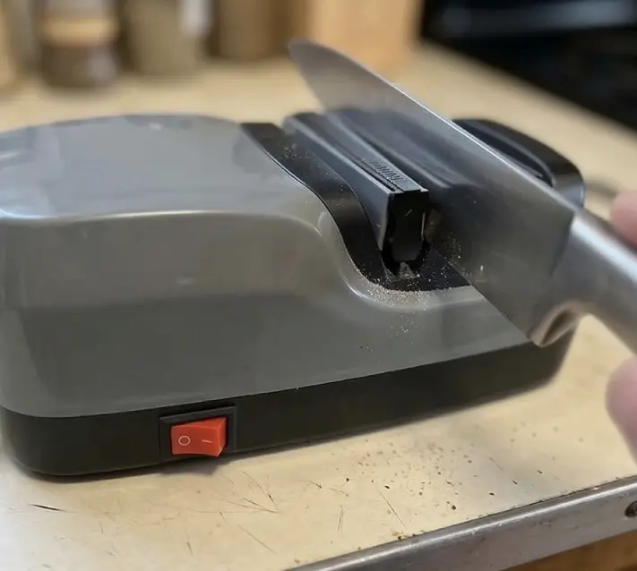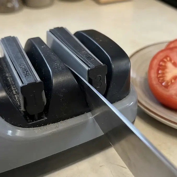 Gently insert the knife into the sharpener's guide, making sure it's properly positioned.